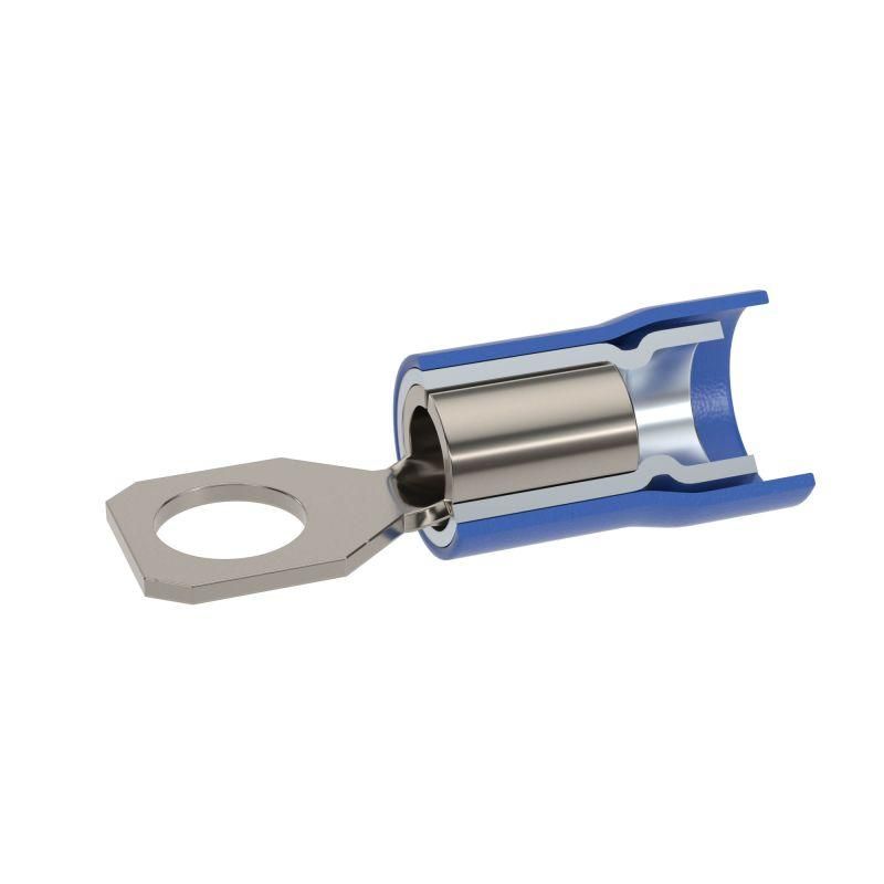 Наконечник с отверстием под винт и изолирующим фланцем ПВХ, двойная гильза, 1,5-2,5 кв.мм М5 (д.5,3мм) (НКИ) от DKC предназначен для надёжного оконцевания проводов в распределительных щитах, пультах управления и силовых цепях. Благодаря изолирующему фланцу и лужению, НКИ снижает риск замыканий и коррозии, особенно в условиях вибраций и повышенной влажности.