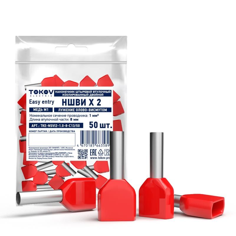 Наконечник штыревой втулочный изолированный двойной НШВИ(2) 1.0-8 от TOKOV ELECTRIC предназначен для надёжного соединения одножильных медных проводов сечением 1 мм2 с штыревыми клеммами. Артикул tke-nsvi2-1.0-8-c13/50 обеспечивает безопасную и долговечную коммутацию в условиях повышенной влажности и вибраций.