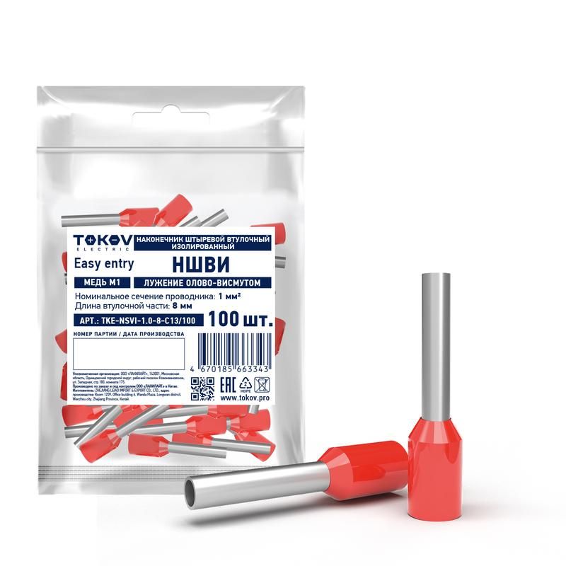 Наконечник штыревой втулочный изолированный НШВИ 1.0-8 TOKOV ELECTRIC TKE-NSVI-1.0-8-C13/100