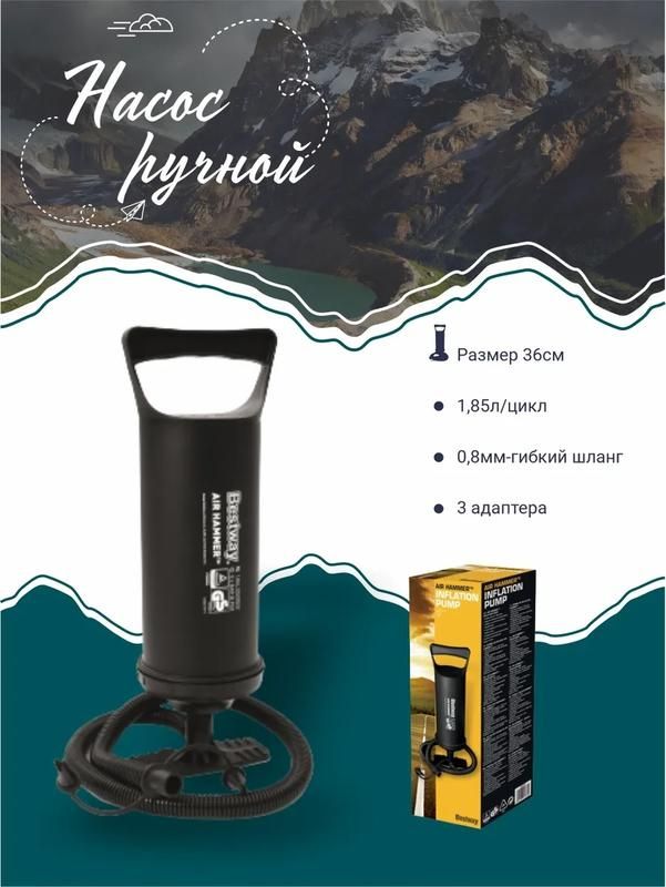 Ручной насос Bestway 36 см для INTEX 62003 - компактное устройство для быстрой накачки надувных матрасов, лодок и других изделий бренда Intex и Bestway. Удобная конструкция с двойным действием и тремя насадками делает его универсальным решением для дома, дачи и путешествий.
