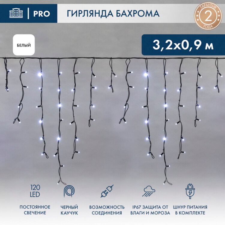 Гирлянда светодиодная Айсикл (бахрома) 3.2 х 0.9 м, 120 LED, белый цвет, 230 В, провод каучук, Neon-Night - это уличная гирлянда с имитацией сосулек, предназначенная для наружного и внутреннего освещения. Благодаря каучуковому проводу и защите IP67, она выдерживает экстремальные температуры и работает в любую погоду. Артикулы etm255-215 и 255-215 соответствуют одной модели из серии PROFESSIONAL.