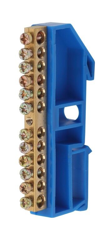 Шина ноль на DIN-изоляторе ШНИ-6х9-12-Д синий NO-222-47 устанавливается на стандартную DIN-рейку шириной 35 мм. Для монтажа достаточно защёлкнуть её на рейку - никаких дополнительных креплений не требуется. Каждый контакт имеет винтовой зажим с плоской головкой, которая не перекусывает жилы. Перед подключением зачистите провод на 8–10 мм, вставьте его в отверстие и затяните винт моментом 0,5–0,7 Нм. Не используйте силовые инструменты - переусилие может повредить резьбу или деформировать латунь.