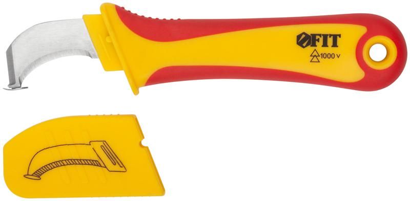 Нож изолированный 1000 В с пяткой от FIT (артикул 10604) - специализированный инструмент для безопасного снятия изоляции с кабелей при напряжении до 1000 В. Подходит для точной работы с плоскими проводами, где важна защита жилы и контроль глубины реза.