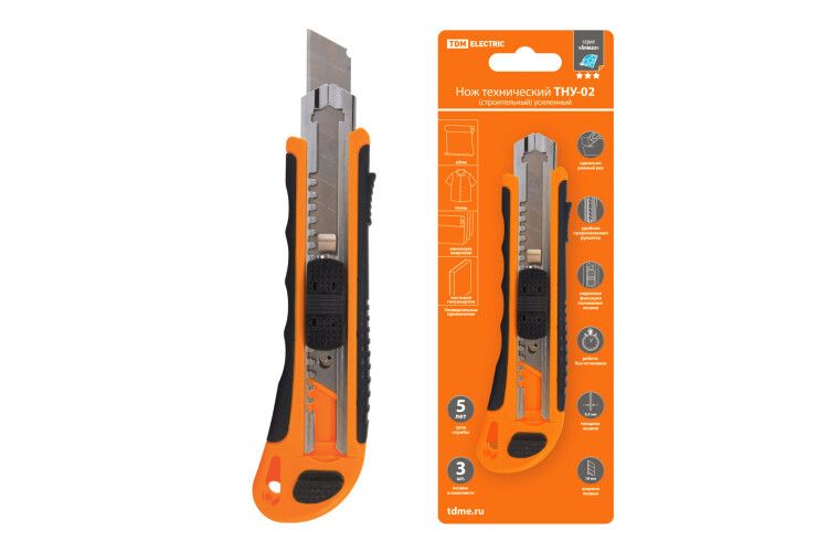Нож технический (строительный) усиленный, ТНУ-02, 18 мм, 3 сегментированных лезвия, автоматическая смена, серия Алмаз от TDM ELECTRIC - надёжный инструмент для точного реза упаковки, изоляции кабелей и других материалов на стройплощадках и в мастерских. Артикул sq1033-0102 обеспечивает быструю замену лезвий без лишних движений.