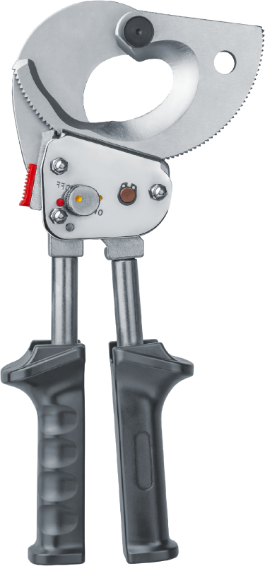Ножницы секторные для бронированного кабеля, 45 мм совместимы со всеми типами кабелей, имеющими броню: ААБл, АСБ, ВВБШв, КГ, а также с одножильными и многожильными проводниками до 500 кв.мм. Для правильного монтажа важно соблюдать угол реза - инструмент следует располагать перпендикулярно оси кабеля. Храповый механизм требует минимального усилия, поэтому не нужна фиксация кабеля в тисках. После завершения реза подвижное лезвие легко разблокируется одним нажатием кнопки на рукоятке.