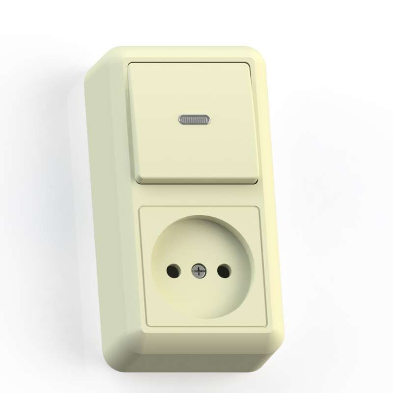 Блок комбинированный открытого установочного типа БКВР-430 слоновой кости от Кунцево-Электро сочетает в себе одноклавишный выключатель с подсветкой и двухконтактную розетку - удобное решение для быстрого монтажа в помещениях с открытой проводкой.