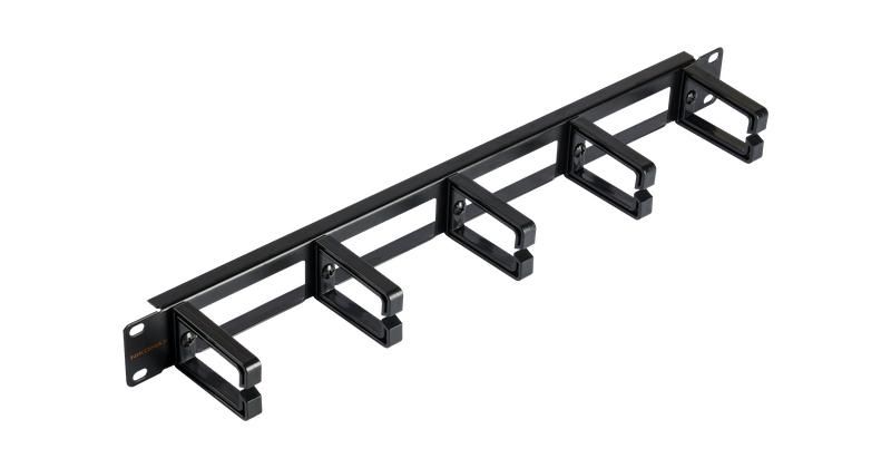 Основание выполнено из гнутого металла - обеспечивает жесткость и долговечность даже при нагрузке несколькими пучками кабелей. Пластиковые кольца закреплены так, чтобы не расшатываться при многократном использовании. Конструкция не имеет острых краев, исключает повреждение изоляции кабелей. Благодаря компактному исполнению, органайзер не выступает за плоскость стойки и не мешает работе других устройств.