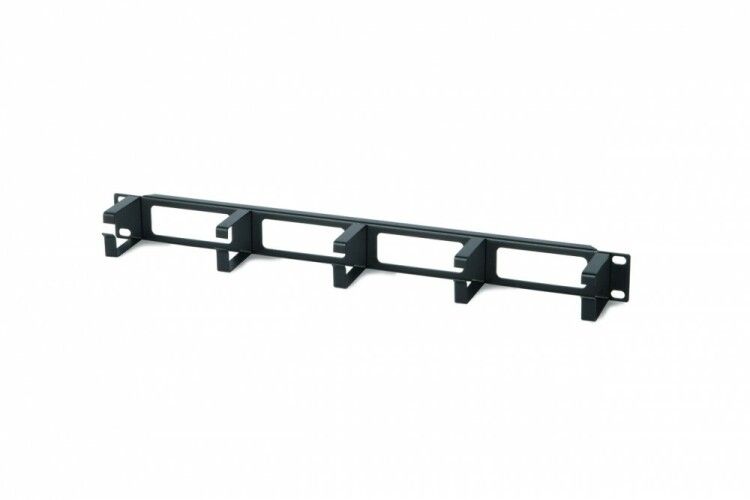 Изделие выполнено из прочного металла, что исключает деформацию даже при нагрузке множеством кабелей. Металлические кольца имеют гладкие кромки - не повреждают изоляцию кабелей. Гorizontalная ориентация позволяет равномерно распределить кабели вдоль стойки, а не вертикально, что важно для плотно укомплектованных стоек. Черный цвет не выделяется на фоне оборудования и не бликует.
