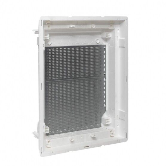 Основание совместимо с DIN-рейками типа TS35/7,5 и TS35/15, которые крепятся внутри корпуса. Монтажная плата позволяет фиксировать устройства без рамок - например, маршрутизаторы или медиаплееры - с помощью двустороннего скотча, винтов или специальных кронштейнов. Для установки в гипсокартон в комплекте предусмотрены крепежные элементы (распорные болты и планки). Глубина 90 мм требует подготовленной ниши такой же глубины. Крышка с вырезом упрощает вывод кабелей без дополнительного сверления.