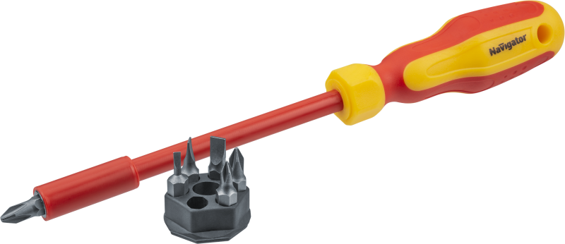 Отвертка с сменными битами (6 штук) от Navigator (арт. 80285) - универсальный инструмент для точного закручивания и откручивания крепежа с магнитной фиксацией бит. Подходит для работы в условиях ограниченного доступа, где важна компактность и быстрая замена насадок.