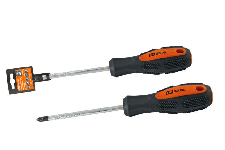 Отвертка крестовая двухкомпонентная, CR-V тип PH0x100, серия Алмаз от TDM ELECTRIC - инструмент для точного завинчивания и отвинчивания крепежа с крестовым шлицем Phillips, оптимально подходящий для работы в электротехнических шкафах, на сборочных линиях и при монтаже клеммных соединений.