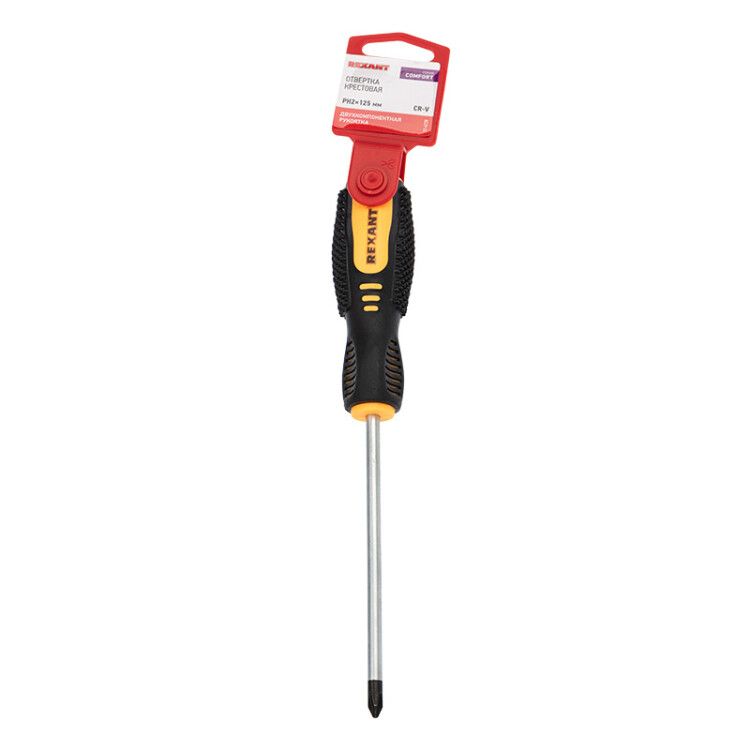 Отвертка крестовая PH 2 х 125 мм, двухкомпонентная рукоятка от бренда REXANT - надежный инструмент для точного закручивания и откручивания шурупов с крестовым шлицем. Артикул 12-4728 подойдет как для профессионального монтажа, так и для бытовых задач, где важна точность и комфорт.