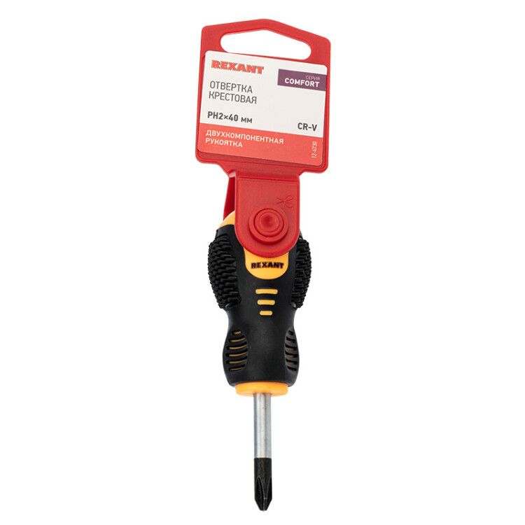 Отвертка крестовая PH 2 х 40 мм, двухкомпонентная рукоятка от бренда REXANT (арт. 12-4730) - надёжный инструмент для точного закручивания и откручивания шурупов с крестообразным шлицем. Подходит для работы в условиях ограниченного доступа благодаря компактной длине и устойчивой рукоятке.