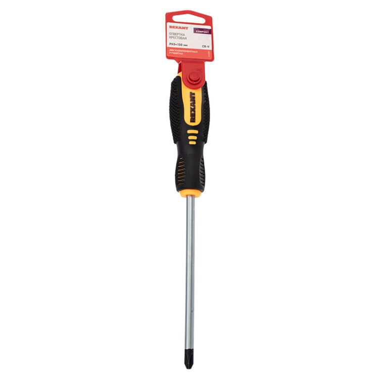 Отвертка крестовая PH 3 х 150 мм, двухкомпонентная рукоятка от REXANT (арт. 12-4729) - надёжный инструмент для точного закручивания и откручивания крепёжа с крестообразными шлицами. Подходит для работы на сборочных линиях, в электротехнике и при обслуживании оборудования.