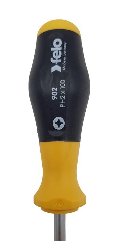 Отвертка крестовая PH2x100 от Felo (артикул 90220310) - надежный инструмент для точного закручивания и откручивания крепежа типа PZ2. Разработана в серии 900 с учетом требований профессионального монтажа, сочетает прочность лезвия и комфортную эргономику рукоятки.
