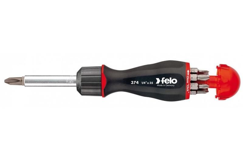 Отвертка с реверсивным механизмом с набором бит 8 штук от Felo (артикул 37420405, серия 370) - компактный многофункциональный инструмент для точной сборки и демонтажа крепежа в узких местах. Комбинирует надежную отвертку с удобным хранилищем для всех бит, что делает её идеальным решением для мастерских, сервисных центров и полевых работ.