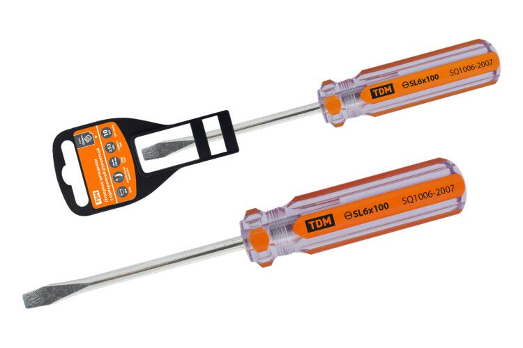 Отвертка шлицевая, прозрачная рукоятка, углеродистая сталь, тип SL6.0 x 100 мм, серия "Гранит" от TDM ELECTRIC - это инструмент, предназначенный для проведения слесарно-монтажных работ, соединения и разъединения шлицевого/фигурного крепежа. Она идеально подходит для регулировки электротехнических устройств, монтажа крепежных изделий и клемм, а также для сборки конструкций, где используется шлицевой и крестовой крепеж.