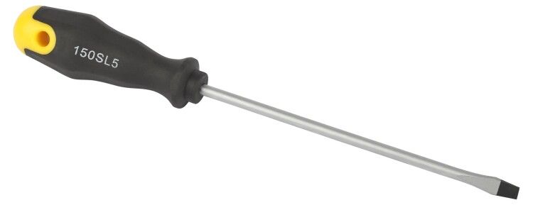 Отвертка шлицевая SL 5х150 мм двухкомпонентная рукоятка используется для работы с крепежом, имеющим один прямой желобок на головке - типично для бытовых устройств, корпусной мебели, электрооборудования и легких металлических конструкций. Подходит для ситуаций, где не требуется высокий крутящий момент. Не рекомендуется для плотного закручивания в твердые материалы без предварительного сверления отверстий.