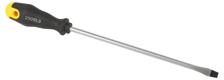 Отвёртка шлицевая SL 8×250 мм с двухкомпонентной рукояткой предназначена для завинчивания и вывинчивания крепёжных элементов с прямым (шлицевым) типом головки. Подходит для задач, где не требуется высокий крутящий момент - например, сборка корпусов, установка панелей, монтаж электроники, ремонт бытовых приборов и осветительного оборудования. Часто применяется в электротехнических работах благодаря изолированной рукоятке.