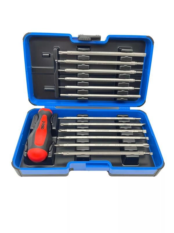Отвёртка торцевая с набором насадок 12 шт в кейсе от Felo (артикул 06091346) - многофункциональный инструмент, сочетающий в себе 12 сменных насадок и двухпозиционную эргономичную рукоятку, позволяющую выполнять работы в ограниченном пространстве или при необходимости большего рычага. Подходит для сборки, ремонта и обслуживания оборудования в условиях производства, автосервиса и домашней мастерской.