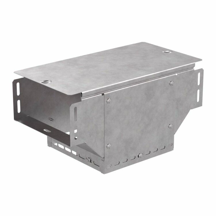 Ответвитель Т-образный вертикальный с крышкой 200х200х100 мм сталь оцинкованная методом Сендзимира серый Промрукав совместим со всеми стандартными металлическими лотками того же размера (200×100 мм и 200×200 мм). Монтаж осуществляется болтовым соединением с помощью комплектных отверстий по бокам и основанию. Крышка фиксируется на защёлках - позволяет легко открывать для обслуживания без демонтажа всего участка. Для герметичности рекомендуется использовать уплотнители при необходимости защиты от пыли и влаги.