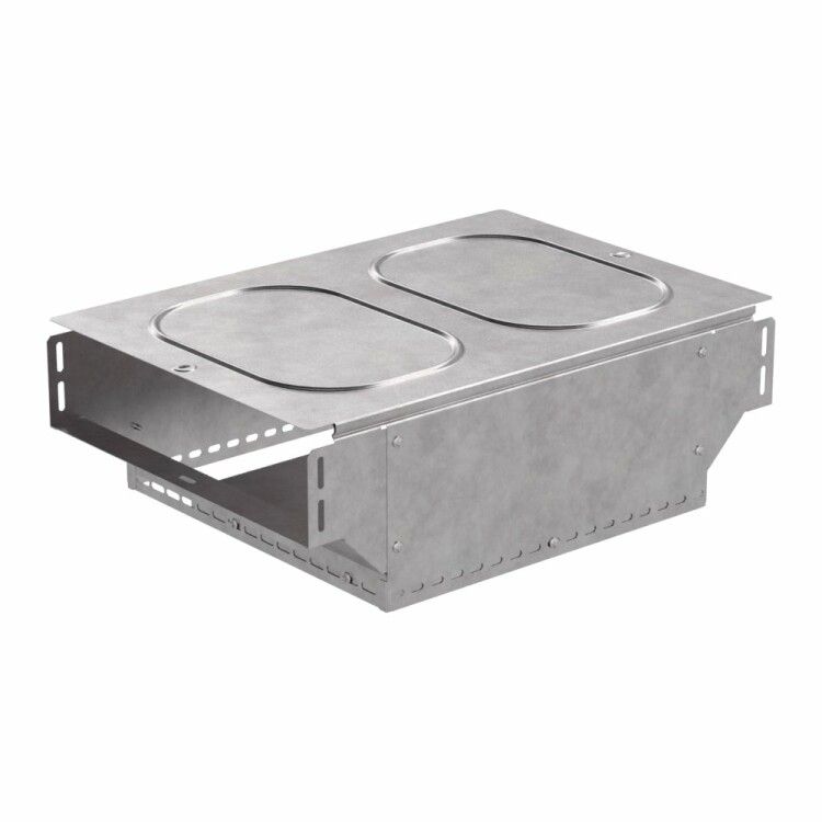 Ответвитель Т-образный вертикальный с крышкой 400х100 сталь оцинкованная методом Сендзимира серый Промрукав совместим со всеми стандартными металлическими лотками шириной 400 мм. Монтируется на боковой поверхности лотка с помощью болтов или самонарезающих винтов через предварительно подготовленные отверстия.