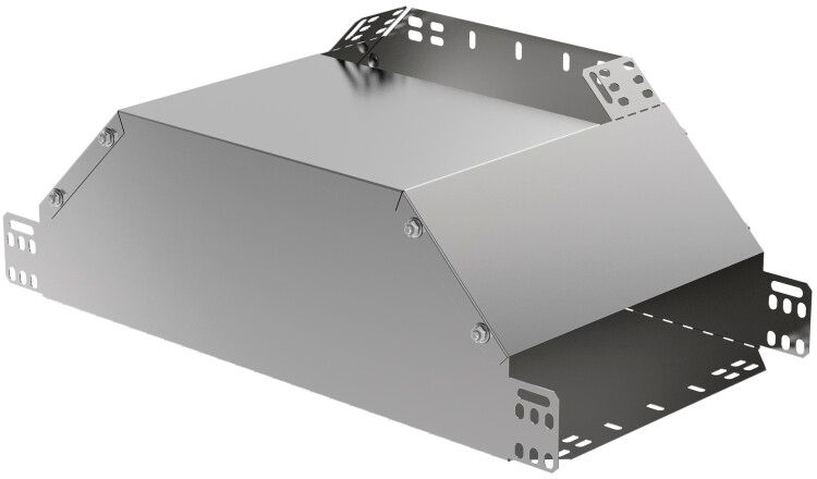 Ответвитель Т-образный вертикальный вверх боковой 100х150 используется для создания Т-образного перехода в кабельной трассе: когда основной лоток проходит горизонтально, а нужен вертикальный отвод вверх. Подходит для прокладки силовых и управляющих кабелей в промышленных объектах, на заводах, в распределительных пунктах и других местах, где требуется компактная смена направления трассы без использования нескольких элементов.