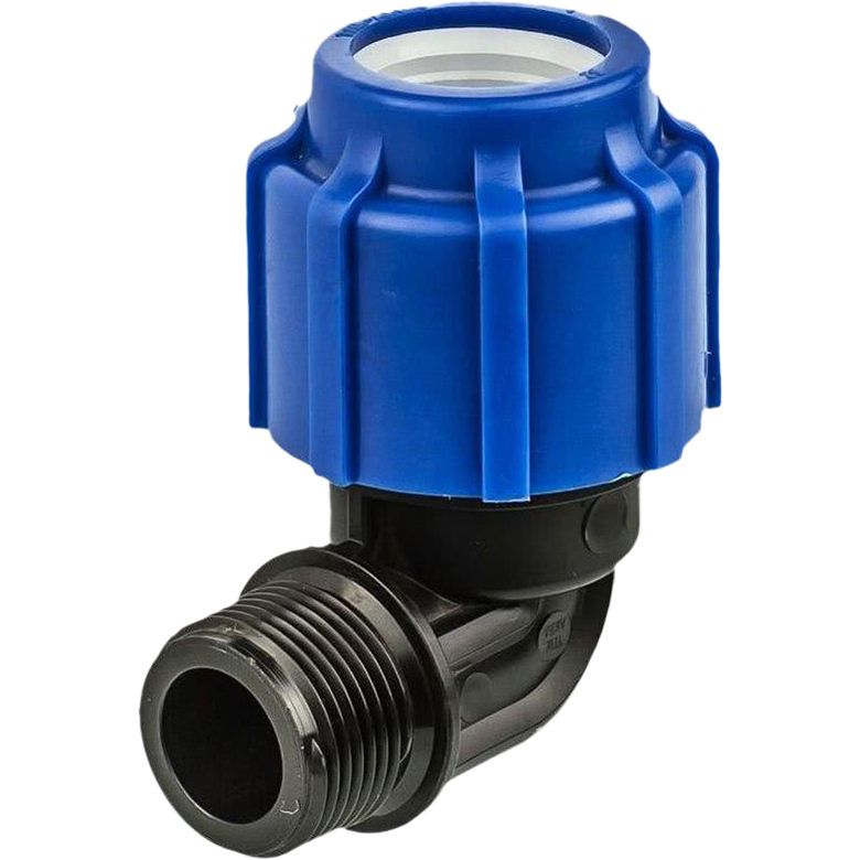 Отвод компрессионный из полиэтилена низкого давления НР 20x3/4 дюйма совместим с трубами ПНД внешним диаметром 20 мм. Для установки: