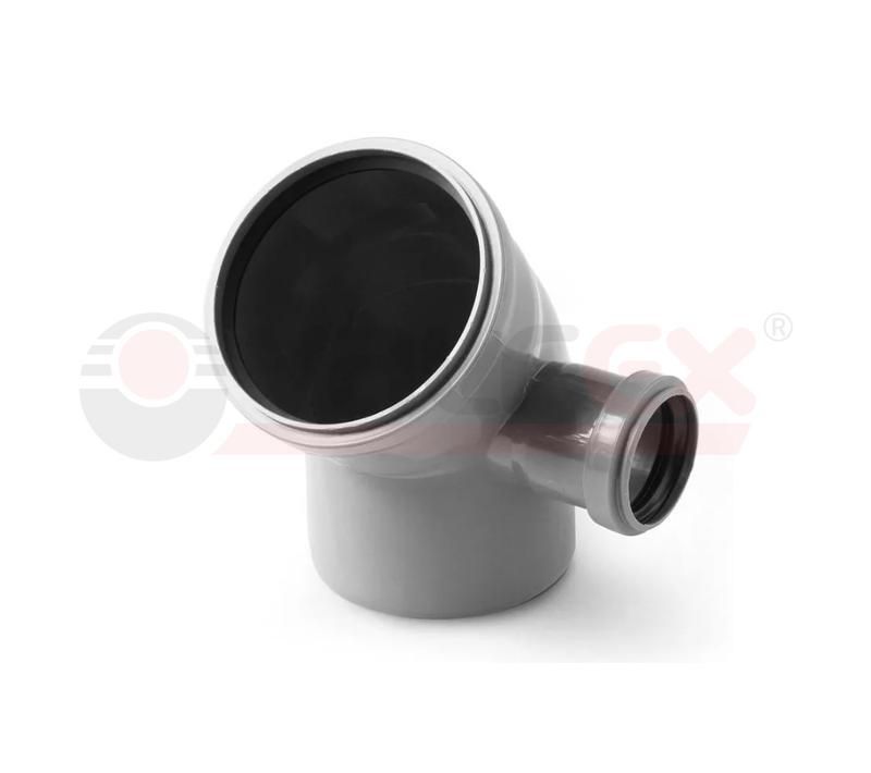 Этот отвод используется для соединения горизонтальных и вертикальных участков канализационных труб в помещениях. Он позволяет выполнить поворот системы с одновременным выводом ответвления диаметром 50 мм - например, для подключения раковины, умывальника или другого сантехнического прибора. Применяется в жилых домах, офисах, больницах, школах и производственных объектах, где требуется сбор и удаление бытовых и серых стоков.