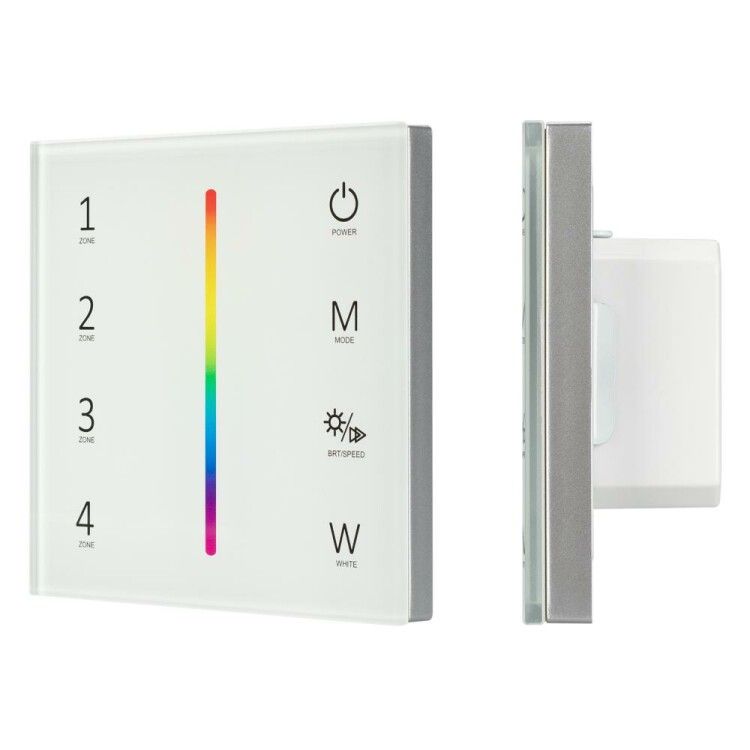 Панель SMART-P45-RGBW White 230V 4 зоны 2.4G IP20 пластик - это встраиваемая сенсорная панель от Arlight для управления четырьмя зонами RGBW-освещения по радиоканалу 2.4 ГГц. Подходит для установки в стены помещений с нормальными условиями эксплуатации, где требуется точечный контроль цвета и яркости светодиодных систем.