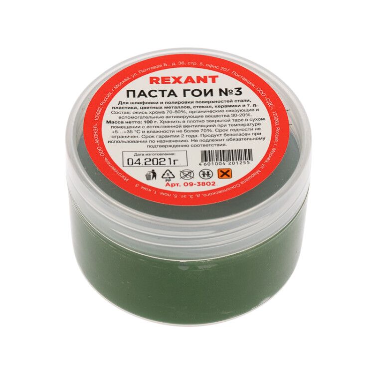 Паста полировальная ГОИ № 3, баночка 100 г от REXANT - среднезернистая абразивная паста на основе оксида хрома, предназначенная для подготовки и финишной полировки металлических, пластиковых и других твёрдых поверхностей. Подходит для ручной и механической обработки, особенно эффективна при работе с цинком, сталью и цветными металлами.
