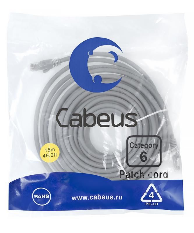 Патч-корд PC-UTP-RJ45-Cat.6-15m-LSZH U/UTP, категория 6, 2xRJ45/8p8c, неэкранированный, серый, LSZH, 15м - 9595c Cabeus