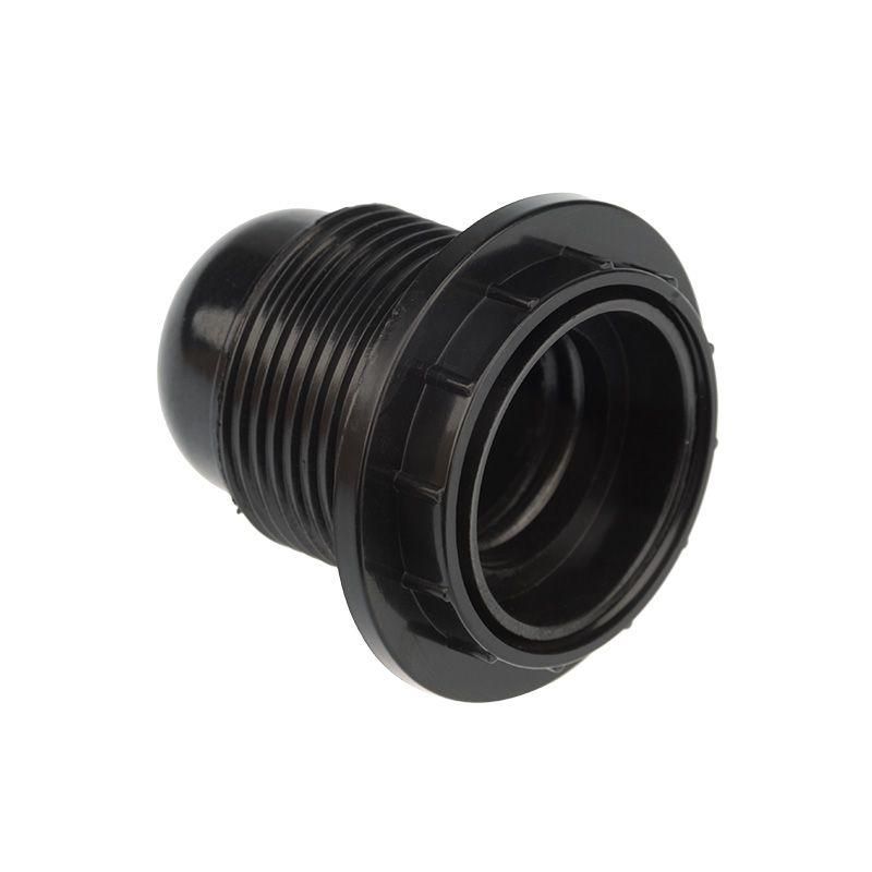 Патрон карbolитовый с кольцом E27 черный с этикеткой используется для механического крепления и электрического подключения ламп накаливания, галогенных и светодиодных источников света с цоколем E27. Применяется в светильниках с подвесными или торшерными конструкциями, где требуется жесткая фиксация плафона через кольцо. Подходит для установки в помещениях с нормальной влажностью, в мастерских, складах, на улице под навесом - там, где важна устойчивость материала к перегреву и химическому воздействию.