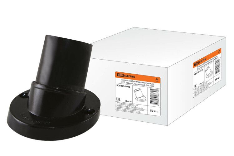 Патрон настенный карbolитовый Е27 черный наклонный без маркировки от TDM ELECTRIC (артикул sq0335-0015) предназначен для надёжного крепления ламп с цоколем E27 в условиях повышенной влажности, запылённости или механических нагрузок - например, на производстве, в гаражах или на улице.