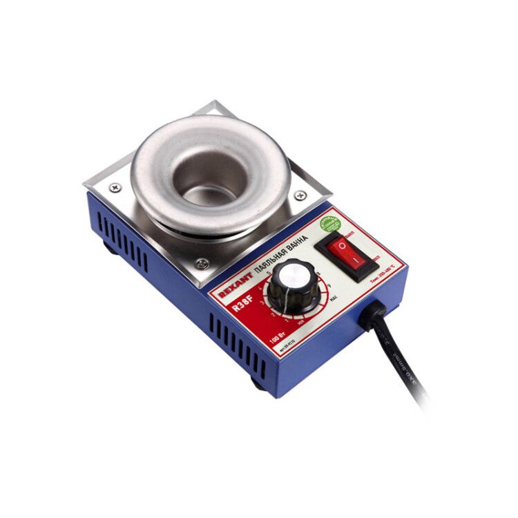 Паяльная ванна Rexant R38F - компактное устройство для лужения проводников и кабельных наконечников в расплавленном бессвинцовом припое. Мощность 100 Вт и точный термоконтроль обеспечивают стабильную работу при температурах от 200 до 480 C. Аппарат рассчитан на профессиональное применение в условиях сборки печатных плат и подготовки соединений.