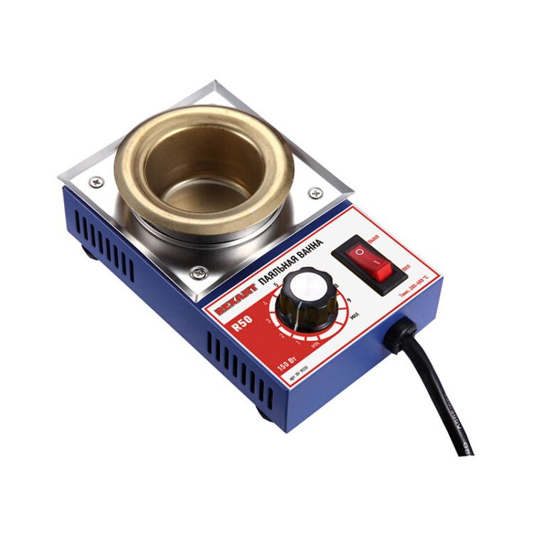 Паяльная ванна Rexant R50 - компактный прибор для лужения проводников и кабельных наконечников в расплавленном припое. Модель R50 рассчитана на работу с малыми объемами припоя, идеально подходит для ремонтных работ и мелкосерийного производства.