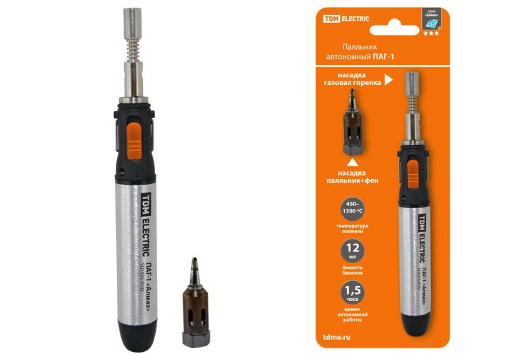 Паяльник автономный газовый ПАГ-1, (3 наконечника: жало, резак, фен), 12 мл "Алмаз" | SQ1025-0102 TDM ELECTRIC - это удобный инструмент для автономной пайки электрических соединений и ремонта электронных приборов. Он также может использоваться для ремонта ювелирных изделий и усадки термоусаживаемой трубки.