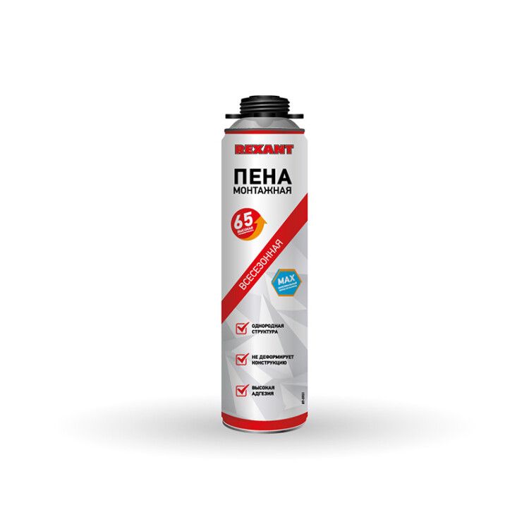 Пена монтажная всесезонная для пистолета 65 литров от Rexant (артикул 89-0901) - однокомпонентная полиуретановая пена, предназначенная для заполнения швов и щелей при монтаже окон, дверей и других элементов зданий. Подходит для работы при температурах до -10 C, обеспечивает надёжную герметизацию на холоде и устойчивую адгезию к большинству строительных поверхностей.