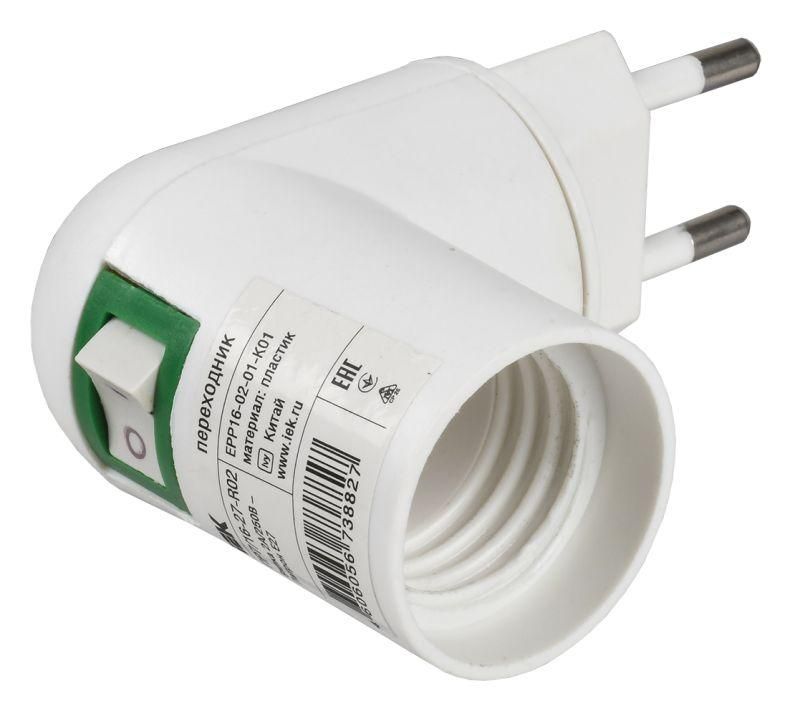 Переходник вилка 220В-патрон Е27 пластик белый IEK | EPP16-02-01-K01