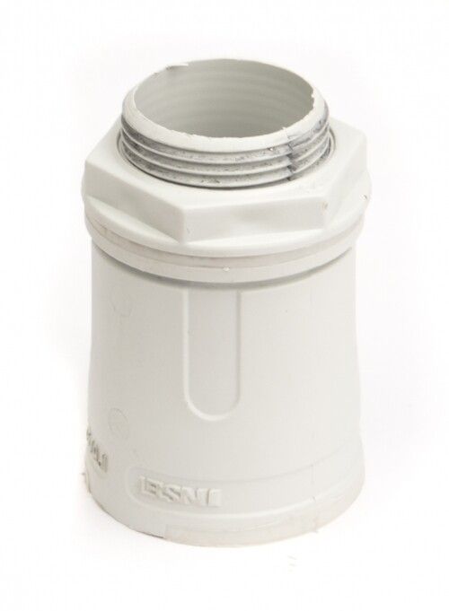 Муфта DKC 50250 имеет наружную резьбу M50×1.5 - она вворачивается во внутреннюю резьбу ответвительной коробки, шкафа или щита. Гладкая часть трубы вставляется в противоположный конец муфты и фиксируется защелкивающимся соединением. Для герметизации достаточно правильно затянуть резьбу рукой - дополнительного усилия не требуется. Соединение не требует сварки, клея или специальных инструментов.