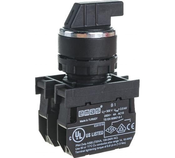 Переключатель 2-позиционный с фиксацией 2 нормально открытых контакта (2НО) IP50 от бренда EMAS, артикул b101s30 - компактное устройство для управления цепями с двумя замкнутыми состояниями, подходит для автоматизации оборудования, где требуется надёжная фиксация положений.