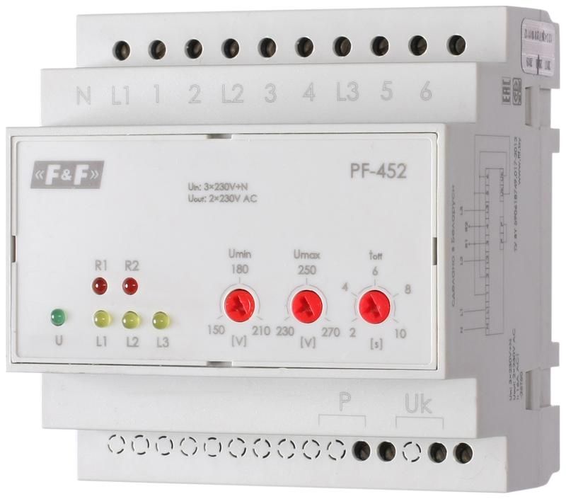 Переключатель фаз PF-452 (два выхода для питания нагрузки; с регулируемыми верхними (230-260) и нижними (150-210) значениями напряжения переключения; монтаж на DIN-рейке 35мм 3х400/230+N 6х16A IP20) F&F EA04.005.004 Евроавтоматика