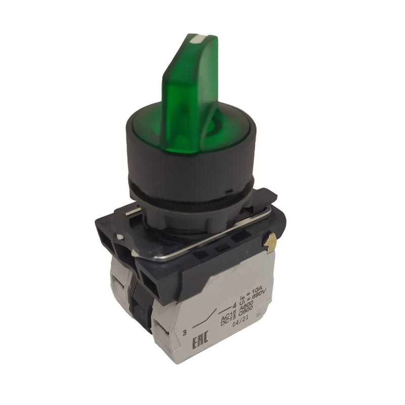 Переключатель КПЕ1110РЛ 220В зеленый 1но+0нз с ручкой фиксации 2-позиционный с индикатором IP40 предназначен для коммутации цепей управления переменным током до 690 В и постоянным током до 440 В. Он используется там, где требуется ручной выбор режима работы: запуск/останов, включение/выключение, переключение между двумя состояниями. Подходит для монтажа в распределительных щитах, на пультах управления, на станках, конвейерах и другом стационарном оборудовании.
