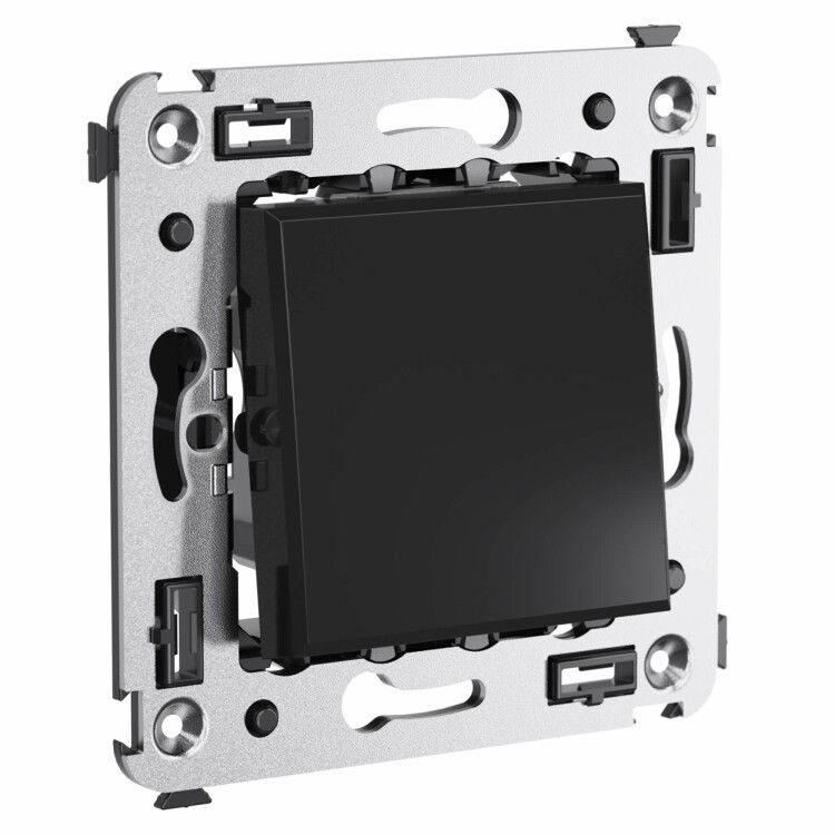 Переключатель одноклавишный в стену 2 модуля 16 А IP20 черный (артикул 4402113) совместим со стандартными подрозетниками диаметром 68–70 мм. Для монтажа требуется предварительно установленный подрозетник, провода подключаются к винтовым клеммам. Крепится механизм с помощью распорных лапок и винтов. Накладка фиксируется после установки механизма. Обязательно соблюдайте полярность при подключении - фаза подается на общий контакт, два других - на перемычки между двумя точками управления. Индикация работает при наличии минимальной нагрузки - не подключайте к устройству только LED-лампы без шунта, если они мерцают.