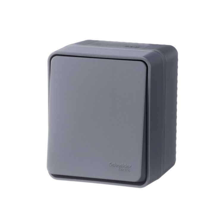 Переключатель проходной одноклавишный 10 А антрацит IP54 рассчитан на открытую установку. Крепится встраиваемой коробкой с помощью винтов - не требует специальных инструментов. Для работы необходима пара таких переключателей (два устройства в одной цепи). Подключаются три провода: фаза, перемычка между переключателями и выход на светильник. Совместим с любыми стандартными проводами сечением до 2,5 мм2. Не подходит для скрытой установки - корпус не имеет фланца для штроб.