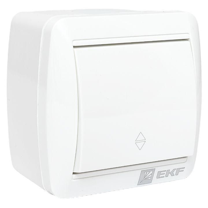 Переключатель проходной 1-клавишный 10А 230В белый глянцевый IP54 от бренда EKF, серия Владивосток - это надёжное устройство для управления освещением из двух мест, предназначенное для наружной и влажной среды. Благодаря защите IP54 и прочному термопласту, он выдерживает пыль, влагу и перепады температур, сохраняя работоспособность даже при открытой установке.