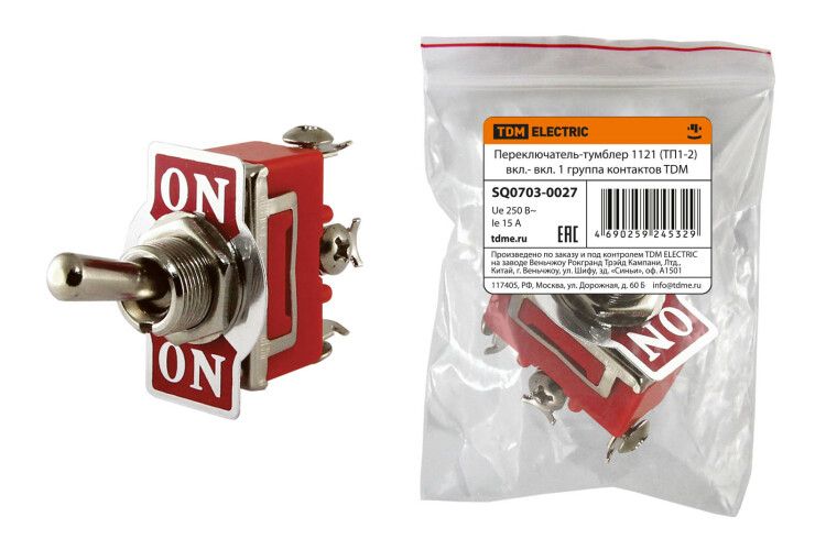 Переключатель-тумблер 1121 (ТП1-2) вкл.- вкл. 1 группа контактов SQ0703-0027 TDM ELECTRIC - это удобное и надежное устройство, предназначенное для использования в электрощитах, промышленном оборудовании и объектах электроснабжения.