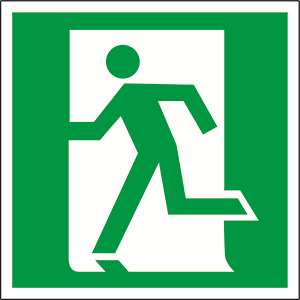 - На стене рядом с аварийным выходом в торговом центре, где маршрут эвакуации направлен влево.