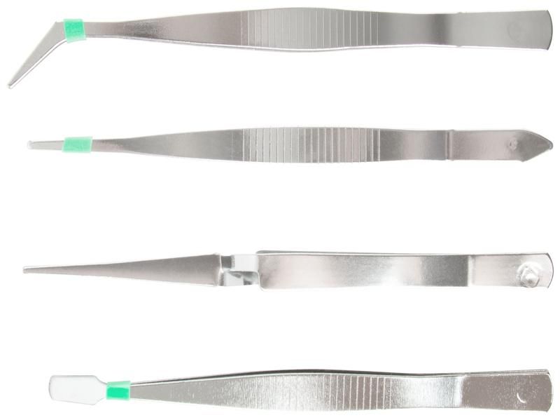 4 пинцета различных форм позволяют производить широкий спектр различных операций|Изготовлены из прочной и износостойкой инструментальной стали|Зауженные губки дают возможность захвата предметов в труднодоступных местах|Рельефная поверхность предотвращает проскальзывание во время работы