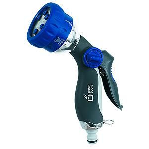 Пистолет-распылитель Green Apple GWHM12-034 - надёжный инструмент из нержавеющей стали с шестью режимами подачи воды, подходящий для полива растений, мойки поверхностей и организации стационарного орошения на даче.